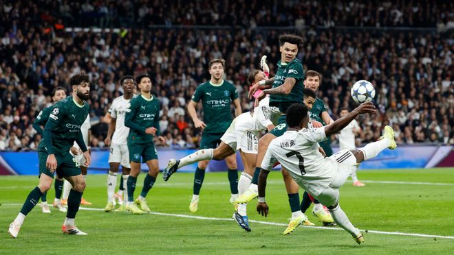 因为就在对阵曼城的比赛中,他是皇马全队射门次数最多的球员(4次尝试)。其中一些机会非常清晰,比如第80分钟,他在居莱尔开出的角球中,用小腿将球挡向了远门柱。