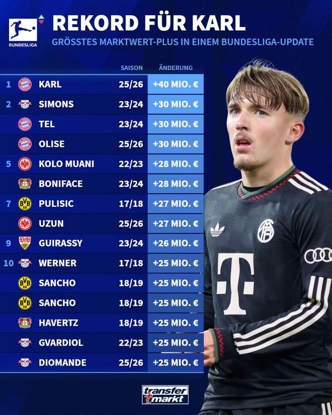 北京时间12月19日德甲日报,德转更新了德甲球员的身价,拜仁慕尼黑17岁新星伦纳特-卡尔身价暴涨4000万欧元,从2000万欧元跃升至6000万欧元。根据德转官方的统计,伦纳特-卡尔也就此成为了自他们2004年开始引入球员身价数据以来,德甲历史涨幅最高的球员。