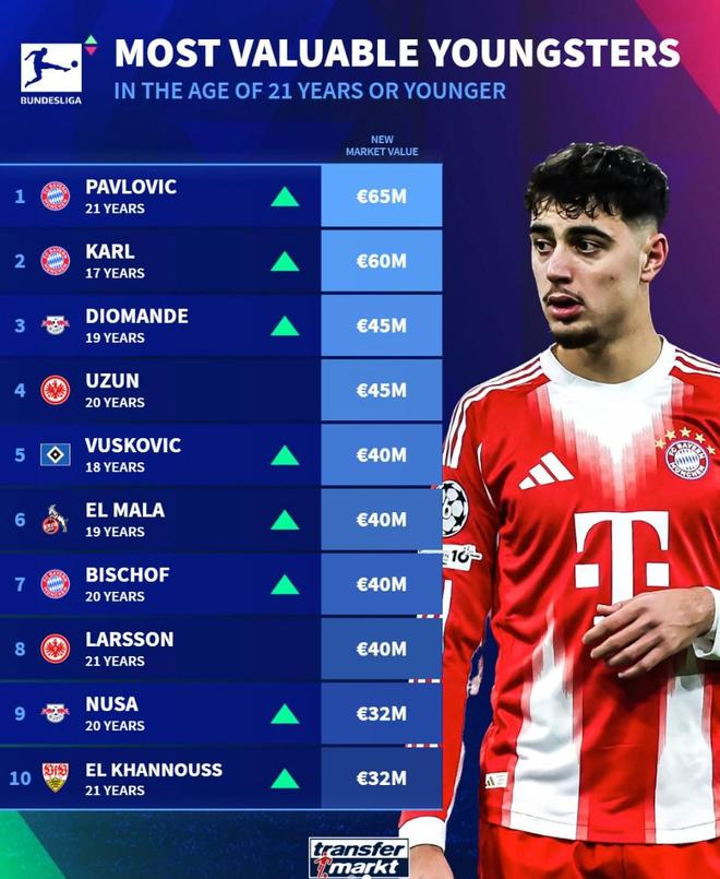 北京时间12月19日德甲日报,在更新了德甲球员的身价之后,德转列出了此次更新后德甲身价最高的10名U21球员,亚历山大-帕夫洛维奇6500万欧元第一,伦纳特-卡尔6000万欧元第二,比朔夫4000万欧元上榜。