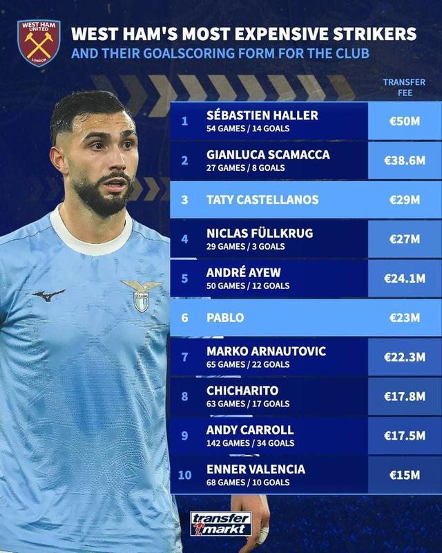 德转统计了西汉姆联队史引进花费最多的十名锋线球员,其中,阿莱以5000万欧元的转会费排名榜首,斯卡马卡第二,今年冬窗加盟球队的卡斯特利亚诺斯、巴勃罗分列第三、第六位。